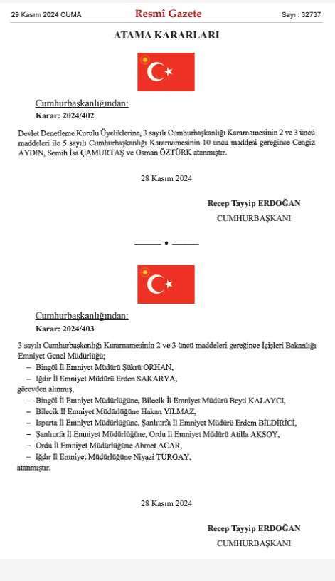 Cumhurbaşkanı Recep Tayyip Erdoğan'ın imzası ile Resmi Gazete’de yayımlanan atama kararlarına göre; Devlet Denetleme Kurulu (DDK) üyeliklerine ve 6 ilin emniyet müdürlüklerine atamalar ve görevden almalar gerçekleşti. Ayrıca, HSK’da 369 hakim ve savcı için görev ve görev yeri değişikliği yapıldı.