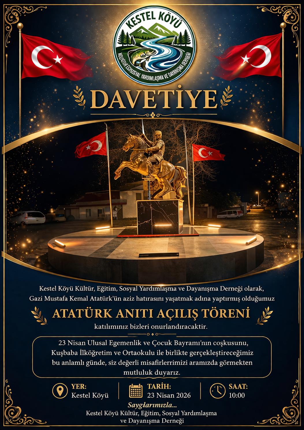 Burdur’ un Bucak ilçesine bağlı Kestel Köyünde Kestel Köyü Kültür, Eğitim, Sosyal Yardımlaşma ve Dayanışma Derneği tarafından yardımseverlerin katkıları ile yaptırılan Ulu Önder Mustafa Kemal Atatürk’ün köy meydanında 23 Nisan 2026 günü saat 10.00’da açılışı yapılacaktır.