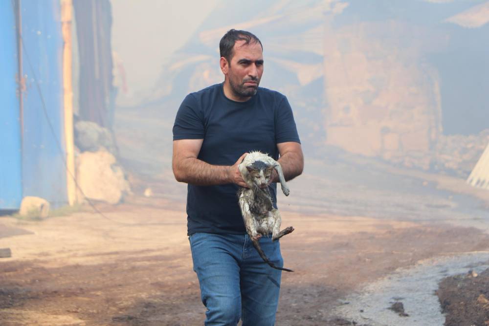 Yangın sırasında komşu mahalle olan Yeşilyayla'dan yardıma gelen Muharrem Karahan, alevlerin sardığı bir evde mahsur kalan kediyi fark etti. Alevlerin içine girerek kediyi dışarı çıkaran Karahan, çeşme suyuyla yıkayarak onu hayata döndürdü.