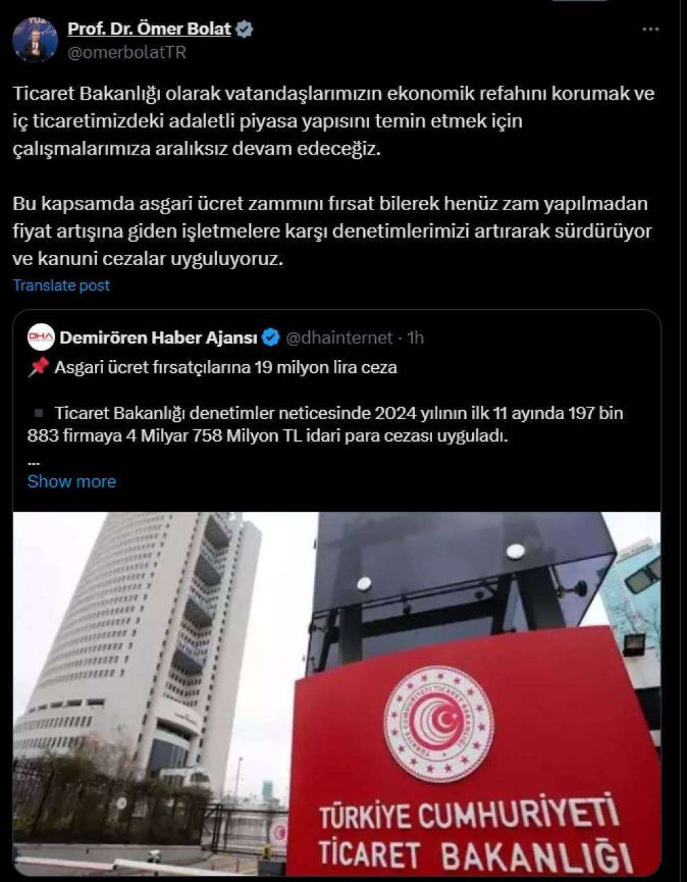 Ticaret Bakanı Ömer Bolat, asgari ücret zammını fırsat bilerek henüz zam yapılmadan fiyat artışına giden işletmelere karşı yapılan denetimlere ilişkin, sosyal medya hesabından açıklama yaptı. Bakan Bolat, "Ticaret Bakanlığı olarak vatandaşlarımızın ekonomik refahını korumak ve iç ticaretimizdeki adaletli piyasa yapısını temin etmek için çalışmalarımıza aralıksız devam edeceğiz. Bu kapsamda asgari ücret zammını fırsat bilerek henüz zam yapılmadan fiyat artışına giden işletmelere karşı denetimlerimizi artırarak sürdürüyor ve kanuni cezalar uyguluyoruz" dedi. (DHA)