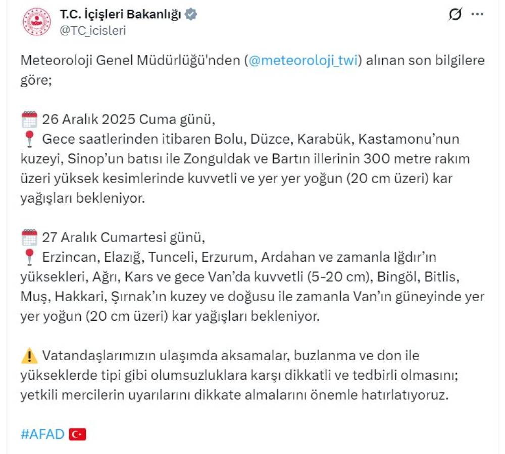 Bakanlığın sanal medya hesabından yapılan açıklamada, "Meteoroloji Genel Müdürlüğü'nden alınan son bilgilere göre; 26 Aralık 2025 Cuma günü gece saatlerinden itibaren Bolu, Düzce, Karabük, Kastamonu'nun kuzeyi, Sinop'un batısı ile Zonguldak ve Bartın illerinin 300 metre rakım üzeri yüksek kesimlerinde kuvvetli ve yer yer yoğun (20 cm üzeri) kar yağışları bekleniyor. 27 Aralık Cumartesi günü, Erzincan, Elazığ, Tunceli, Erzurum, Ardahan ve zamanla Iğdır'ın yüksekleri, Ağrı, Kars ve gece Van'da kuvvetli (5-20 cm), Bingöl, Bitlis, Muş, Hakkari, Şırnak'ın kuzey ve doğusu ile zamanla Van'ın güneyinde yer yer yoğun (20 cm üzeri) kar yağışları bekleniyor. Vatandaşlarımızın ulaşımda aksamalar, buzlanma ve don ile yükseklerde tipi gibi olumsuzluklara karşı dikkatli ve tedbirli olmasını; yetkili mercilerin uyarılarını dikkate almalarını önemle hatırlatıyoruz" denildi. (DHA)