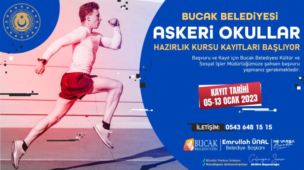 Bucak Belediyesi tarafından başlatılan çalışma ile askeri okullara Hazırlık Kursu’nun kayıtları, 5 Ocak Perşembe günü başlıyor. Bucak Belediyesi tarafından ücretsiz verilecek kurslarda gençler askeri okullar ve Milli Savunma Üniversitesi sınavlarına eğitmenler eşliğinde hazırlanacak. Ücretsiz olarak verilecek olan Askeri Okullara Hazırlık Kursu’nun başvuruları, 5 Ocak- 13 Ocak 2023 tarihleri arasında Bucak Belediyesi Kültür ve Sosyal İşler Müdürlüğüne yapılacak.