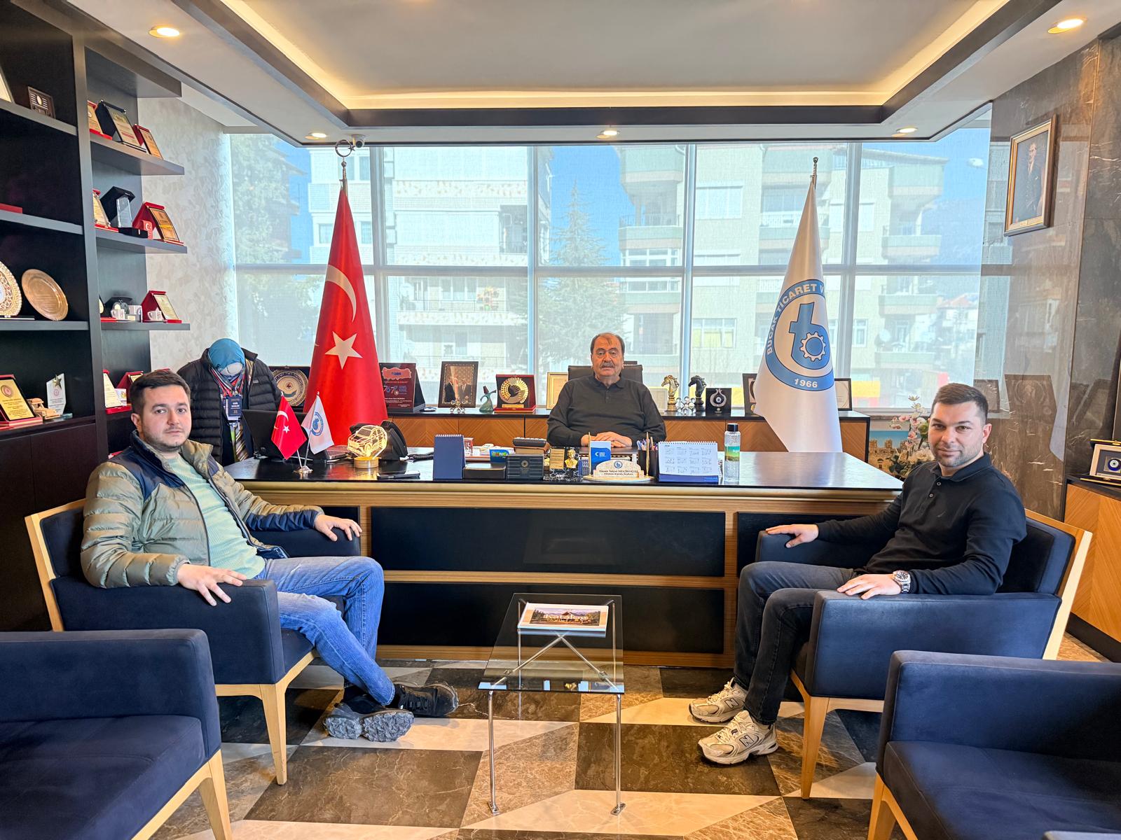 Bucak Ticaret ve Sanayi Odası (TSO) üyeleri Delüxe Ahşap Bungalov iş yeri sahibi Celal Korkmaz ile İskele Deposu İnşaat Sanayi ve Ticaret Limited Şirketi sahibi Buğra Tulunay, Bucak Ticaret ve Sanayi Odası’nı ziyaret etti.