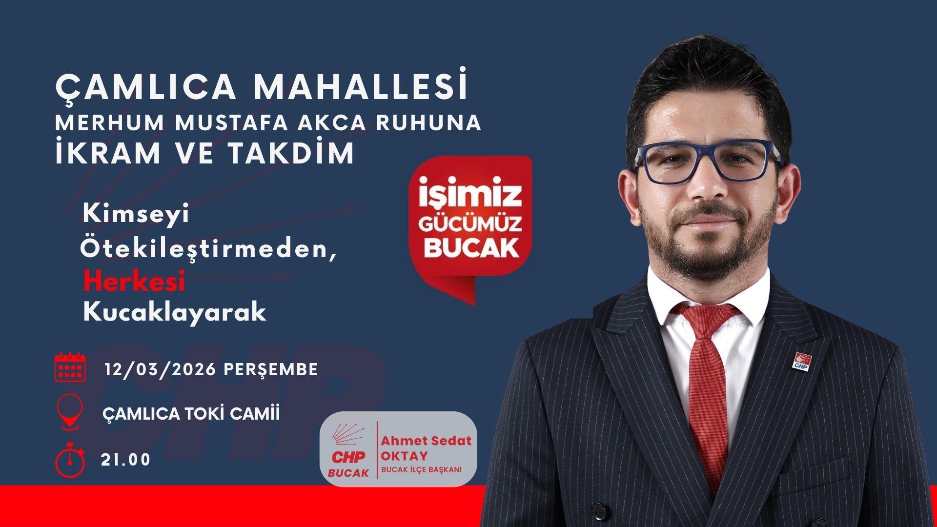 CHP Bucak İlçe Başkanlığı, Çamlıca Mahallesi’nde anlamlı bir anma programı düzenliyor. CHP Bucak İlçe Başkanı Ahmet Sedat Oktay’ın ev sahipliğinde gerçekleştirilecek programda, merhum Mustafa Akca’nın ruhuna ikram ve takdimde bulunulacak.