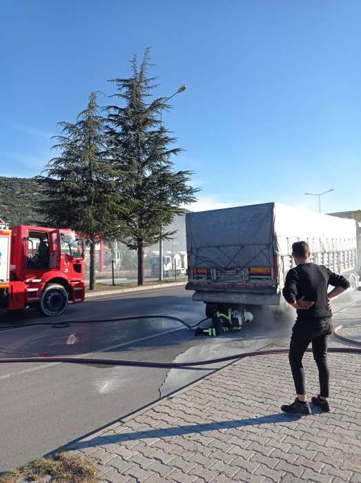 BURDUR’ un Bucak ilçesinde lastiği patlaması ile yanmaya başlayan tırı itfaiyenin erken müdahalesi sonucu yanmaktan kurtardı.