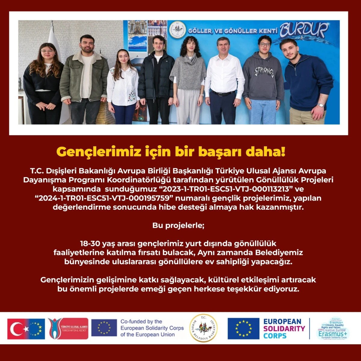 Burdur Belediyesi’nin gençlere yönelik hazırladığı iki proje, T.C. Dışişleri Bakanlığı Avrupa Birliği Başkanlığı Türkiye Ulusal Ajansı tarafından yürütülen Avrupa Dayanışma Programı kapsamında hibe desteği almaya hak kazandı.