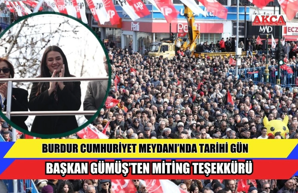 Cumhuriyet Halk Partisi (CHP) tarafından düzenlenen "Millet İradesine Sahip Çıkıyor" mitinglerinin 93’üncüsü, Genel Başkan Özgür Özel’in katılımıyla Burdur’da gerçekleştirildi. Miting sonrası bir açıklama yapan Bucak Belediye Başkanı Hülya Gümüş, meydandaki tarihi kalabalığa dikkat çekerek tüm hemşehrilerine teşekkür etti.