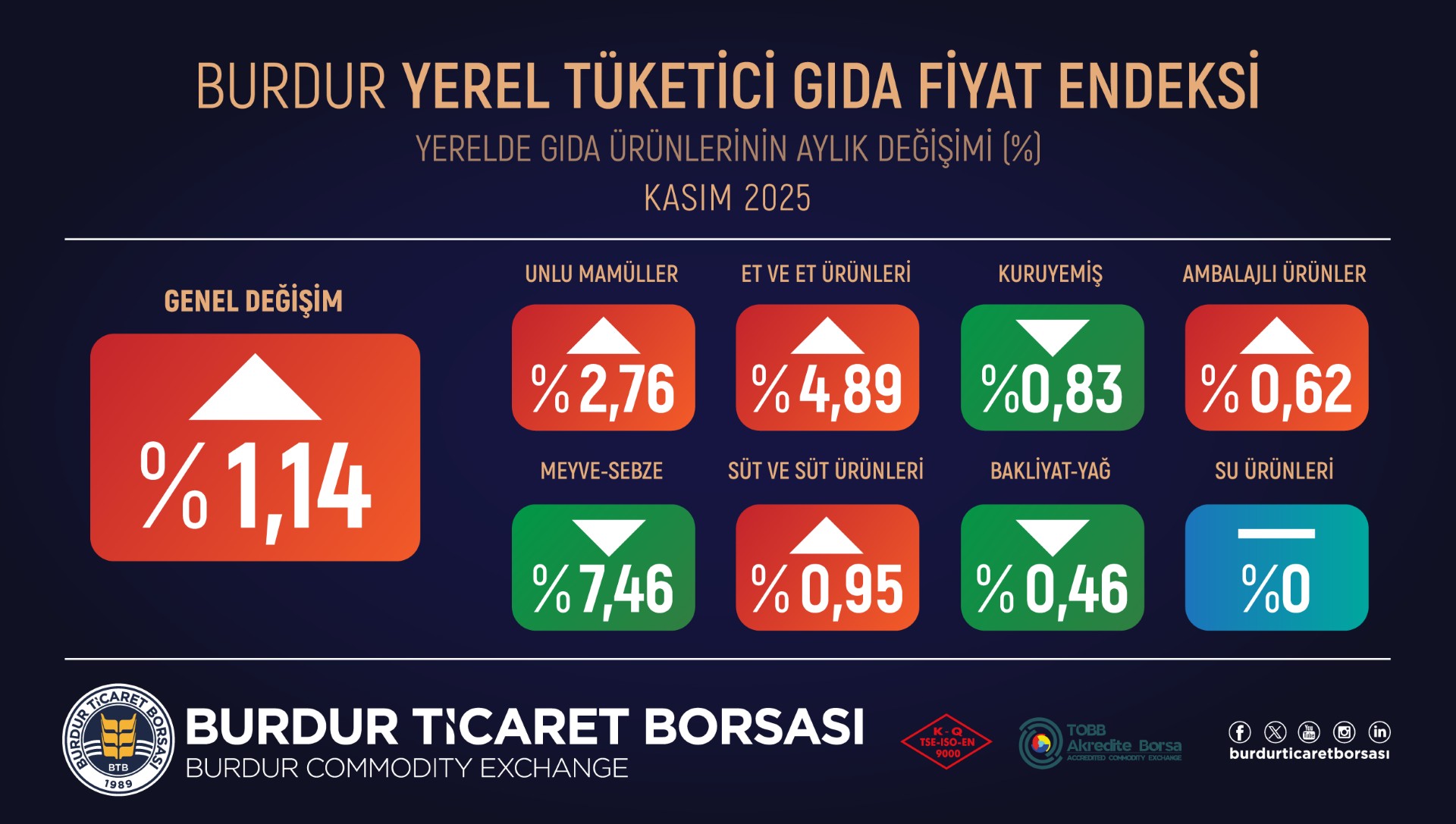 Burdur Ticaret Borsası tarafından hazırlanan Yerel Tüketici Gıda Fiyat Endeksi’nin 2025 yılı Kasım ayı sonuçlarına göre, kentte gıda fiyatları bir önceki aya kıyasla yüzde 1,44 oranında arttı. Açıklanan verilere göre en yüksek artış Et ve Et Ürünleri grubunda yaşanırken, Meyve ve Sebze grubunda belirgin bir düşüş kaydedildi.