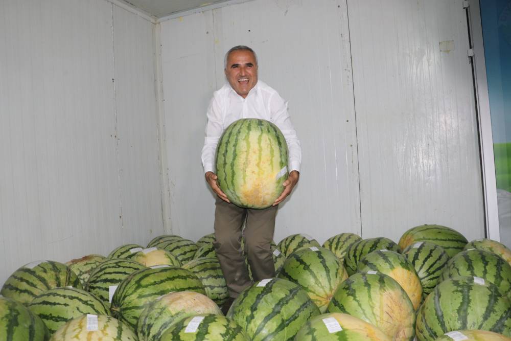 Diyarbakır’ın coğrafi işaretli ürünlerinden büyüklüğüyle ünlü karpuzun hasadı yapıldı. Üreticiler, bu ay içerisinde yapılacak 15’inci Diyarbakır Karpuzu Tanıtım Etkinliği’nde yarışacak karpuzlarını Diyarbakır Süt Üreticileri Birliği’nin soğuk hava deposuna bıraktı. Bir kişinin taşımakta zorlandığı Diyarbakır karpuzunda geçen yıl yarışmaya katılım için belirlenen 25 kiloluk alt sınır, bu yıl kuraklık nedeniyle 20 kiloya indirildi. Etkinliğe sayılı günler kala depoya bırakılan karpuz sayısı 76’ya ulaştı. Üzerinde üreticilerin isimleri yazılı olan karpuzlar, 4 derecede korunuyor. Depoda yaşanacak olası kilo kaybına karşı da jüri tarafından tartılan karpuzların üzerine kiloları yazılarak, etiket yapıştırıldı. Etkinlikte, depoda yapılan bu tartımlar geçerli olacak.