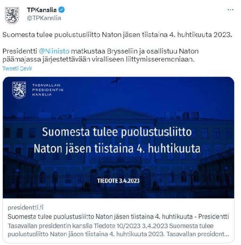 Finlandiya Cumhurbaşkanlığı’ndan yapılan açıklamada, “Finlandiya 4 Nisan 2023 Salı günü savunma ittifakı NATO'nun üyesi olacak. Cumhurbaşkanı Sauli Niinistö Brüksel'e giderek NATO karargahında düzenlenecek resmi katılım törenine katılacak. Finlandiya, Kuzey Atlantik Antlaşması'na katılım belgesini 4 Nisan Salı günü NATO Dışişleri Bakanları toplantısı başlamadan önce Brüksel'de ABD hükümetine teslim edecek. Belgeyi Dışişleri Bakanı Pekka Haavisto teslim edecek. Finlandiya'nın NATO üyeliğini kutlayan bayrak çekme töreni, katılım belgesinin tevdi edilmesinin ardından NATO karargahında gerçekleştirilecek” denildi.