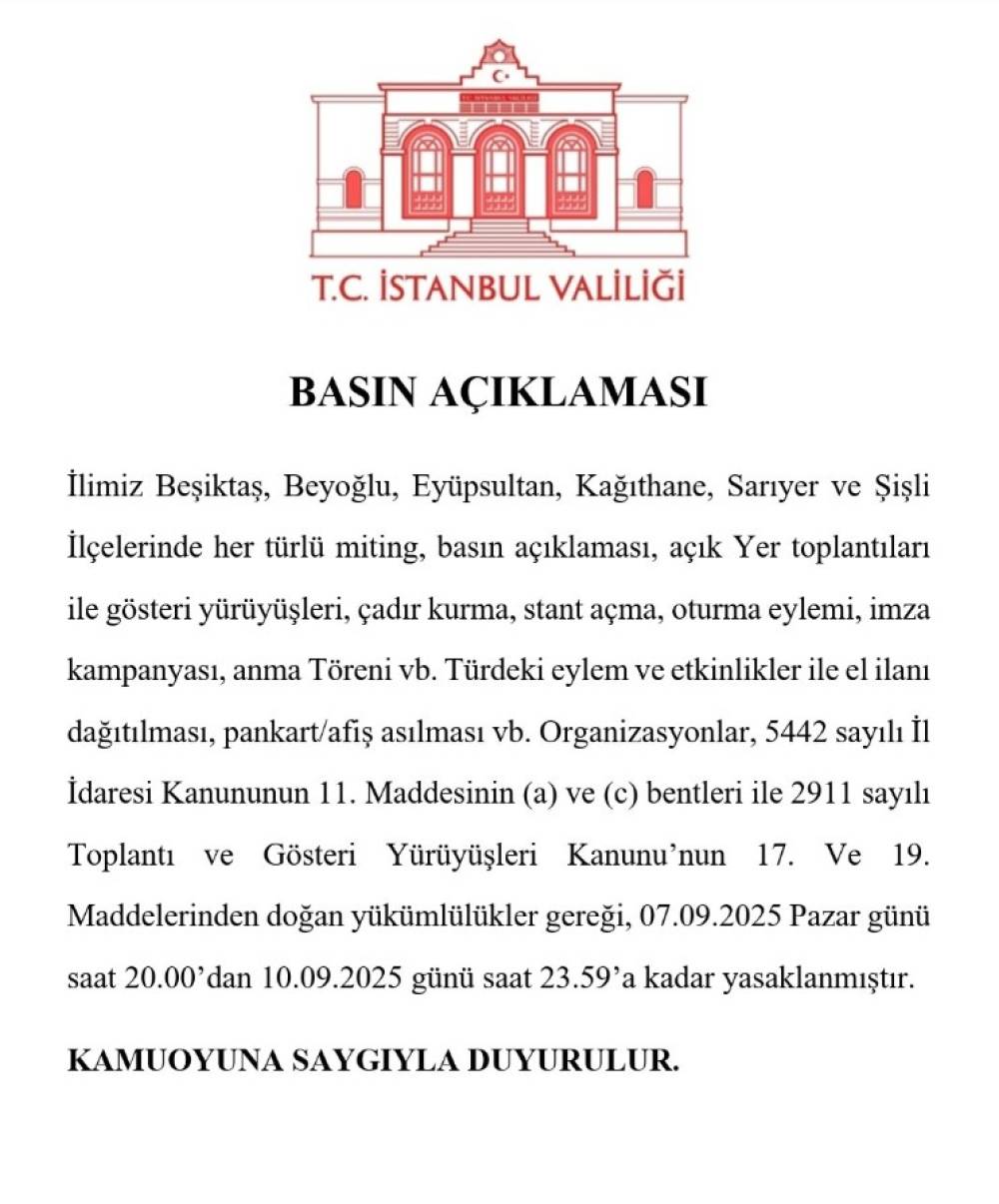 İstanbul Valiliği tarafından, Beşiktaş, Beyoğlu, Eyüpsultan, Kağıthane, Sarıyer ve Şişli ilçelerinde her türlü miting, basın açıklaması, açık yer toplantıları ile gösteri yürüyüşleri, çadır kurma, stant açma, oturma eylemi, imza kampanyası, anma töreni gibi eylem ve etkinlikler ile el ilanı dağıtılması, pankart ve afiş asılması gibi organizasyonların 10 Eylül'e kadar yasaklandığı duyuruldu. Yapılan açıklamada, "İlimiz Beşiktaş, Beyoğlu, Eyüpsultan, Kağıthane, Sarıyer ve Şişli İlçelerinde her türlü miting, basın açıklaması, açık yer toplantıları ile gösteri yürüyüşleri, çadır kurma, stant açma, oturma eylemi, imza kampanyası, anma töreni vb. türdeki eylem ve etkinlikler ile el ilanı dağıtılması, pankart/afiş asılması vb. organizasyonlar, 5442 sayılı İl İdaresi Kanununun 11. maddesinin (a) ve (c) bentleri ile 2911 sayılı Toplantı ve Gösteri Yürüyüşleri Kanunu'nun 17. ve 19. maddelerinden doğan yükümlülükler gereği, 07.09.2025 Pazar günü saat 20.00'dan 10.09.2025 günü saat 23.59’a kadar yasaklanmıştır" ifadeleri kullanıldı.