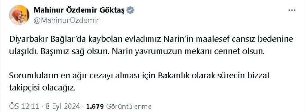 'SÜRECİN BİZZAT TAKİPÇİSİ OLACAĞIZ'Aile ve Sosyal Hizmetler Bakanı Mahinur Özdemir Göktaş, Narin Güran'ın ölümü ile ilgili sorumluların en ağır cezayı alması için sürecin bizzat takipçisi olacaklarını açıkladı. Bakan Göktaş, sosyal medya hesabından yaptığı açıklamada, "Diyarbakır Bağlar'da kaybolan evladımız Narin'in maalesef cansız bedenine ulaşıldı. Başımız sağ olsun. Narin yavrumuzun mekanı cennet olsun. Sorumluların en ağır cezayı alması için Bakanlık olarak sürecin bizzat takipçisi olacağız" dedi. (DHA)FOTOĞRAFLI