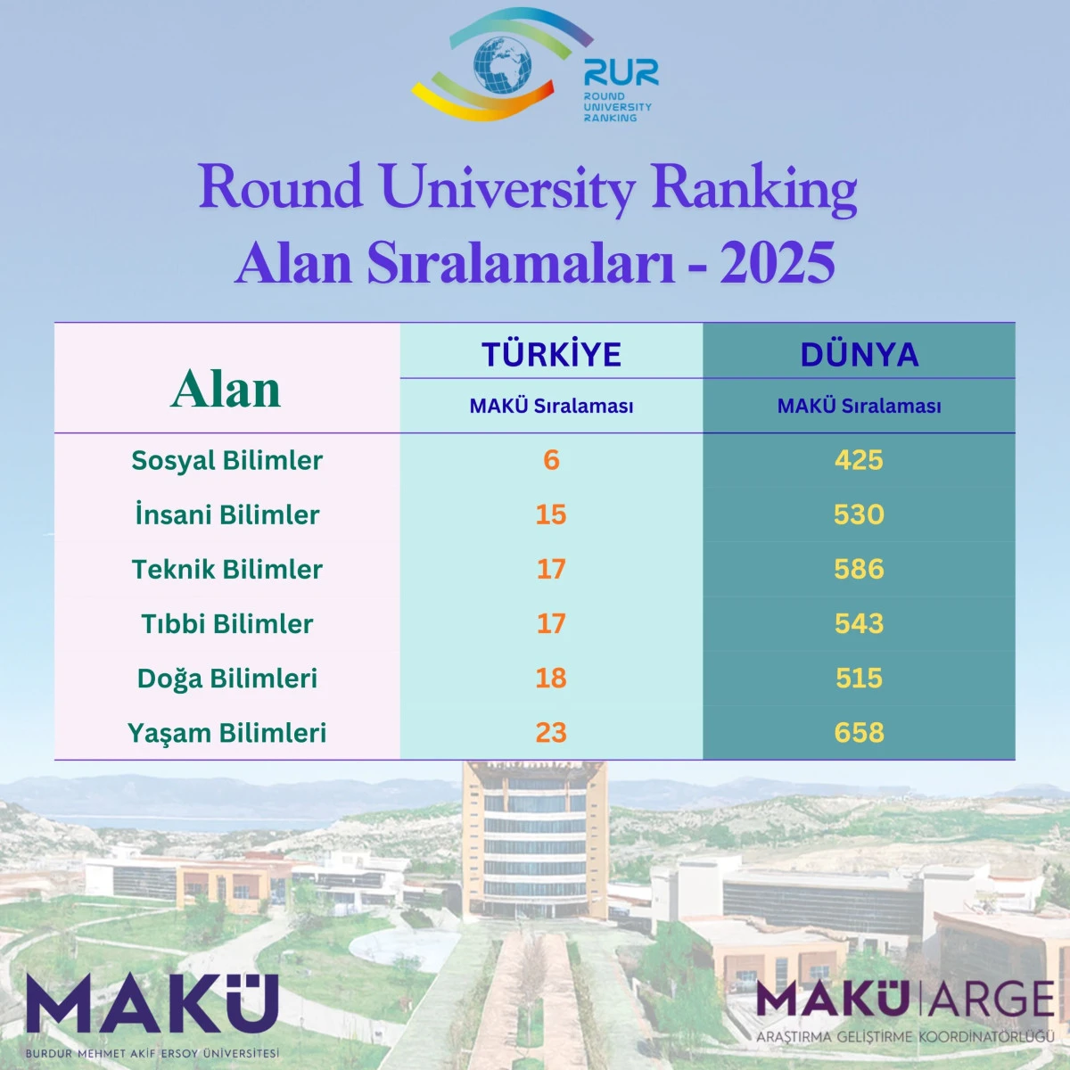 RUR sonuçlarına göre MAKÜ’nün alan sıralamaları şu şekilde gerçekleşti: