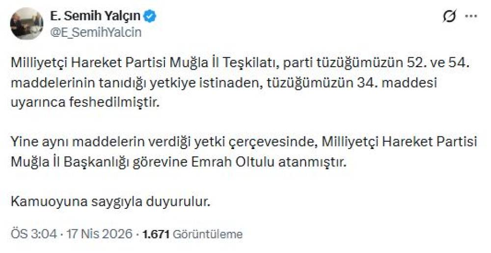MHP'li Semih Yalçın, sanal medya hesabından yaptığı açıklamada, "Milliyetçi Hareket Partisi Muğla İl Teşkilatı, parti tüzüğümüzün 52 ve 54'üncü maddelerinin tanıdığı yetkiye istinaden, tüzüğümüzün 34'üncü maddesi uyarınca feshedilmiştir. Yine aynı maddelerin verdiği yetki çerçevesinde, Milliyetçi Hareket Partisi Muğla İl Başkanlığı görevine Emrah Oltulu atanmıştır" ifadelerini kullandı. (DHA)