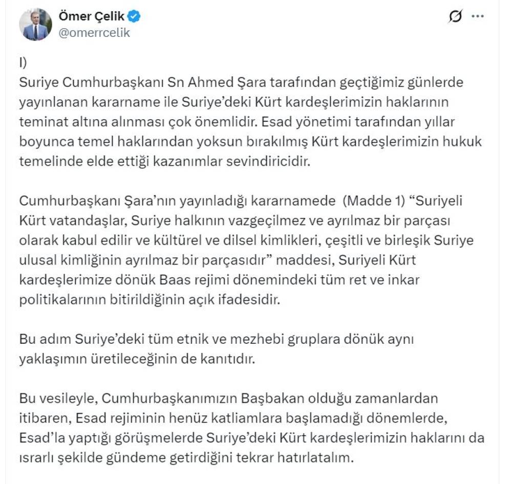 AK Parti Sözcüsü Ömer Çelik, Suriye'deki gelişmelere ilişkin sanal medya hesabından açıklama yaptı. Çelik, "Suriye Cumhurbaşkanı Sayın Ahmed Şara tarafından geçtiğimiz günlerde yayımlanan kararname ile Suriye'deki Kürt kardeşlerimizin haklarının teminat altına alınması çok önemlidir. Esad yönetimi tarafından yıllar boyunca temel haklarından yoksun bırakılmış Kürt kardeşlerimizin hukuk temelinde elde ettiği kazanımlar sevindiricidir. Cumhurbaşkanı Şara'nın yayımladığı kararnamede (Madde 1) 'Suriyeli Kürt vatandaşlar, Suriye halkının vazgeçilmez ve ayrılmaz bir parçası olarak kabul edilir ve kültürel ve dilsel kimlikleri, çeşitli ve birleşik Suriye ulusal kimliğinin ayrılmaz bir parçasıdır' maddesi, Suriyeli Kürt kardeşlerimize dönük Baas rejimi dönemindeki tüm ret ve inkar politikalarının bitirildiğinin açık ifadesidir. Bu adım Suriye’deki tüm etnik ve mezhebi gruplara dönük aynı yaklaşımın üretileceğinin de kanıtıdır. Bu vesileyle Cumhurbaşkanımızın Başbakan olduğu zamanlardan itibaren, Esad rejiminin henüz katliamlara başlamadığı dönemlerde, Esad’la yaptığı görüşmelerde Suriye’deki Kürt kardeşlerimizin haklarını da ısrarlı şekilde gündeme getirdiğini tekrar hatırlatalım. Suriye yönetimi devrimden sonra pek çok zorlukla karşı karşıya kaldı. Bunların başında terör örgütlerinin istikrarsızlaştırıcı faaliyetleri gelmektedir. DEAŞ terör örgütüyle mücadelenin kesintisiz sürmesi açık bir gerçek ve gerekliliktir. Ayrıca SDG terör örgütünün faaliyetleri ve 'talimatıyla hareket ettiği odakların siyasi hedefleri' hem Suriye hem Türkiye için tehdit teşkil etmektedir" ifadelerini kullandı.