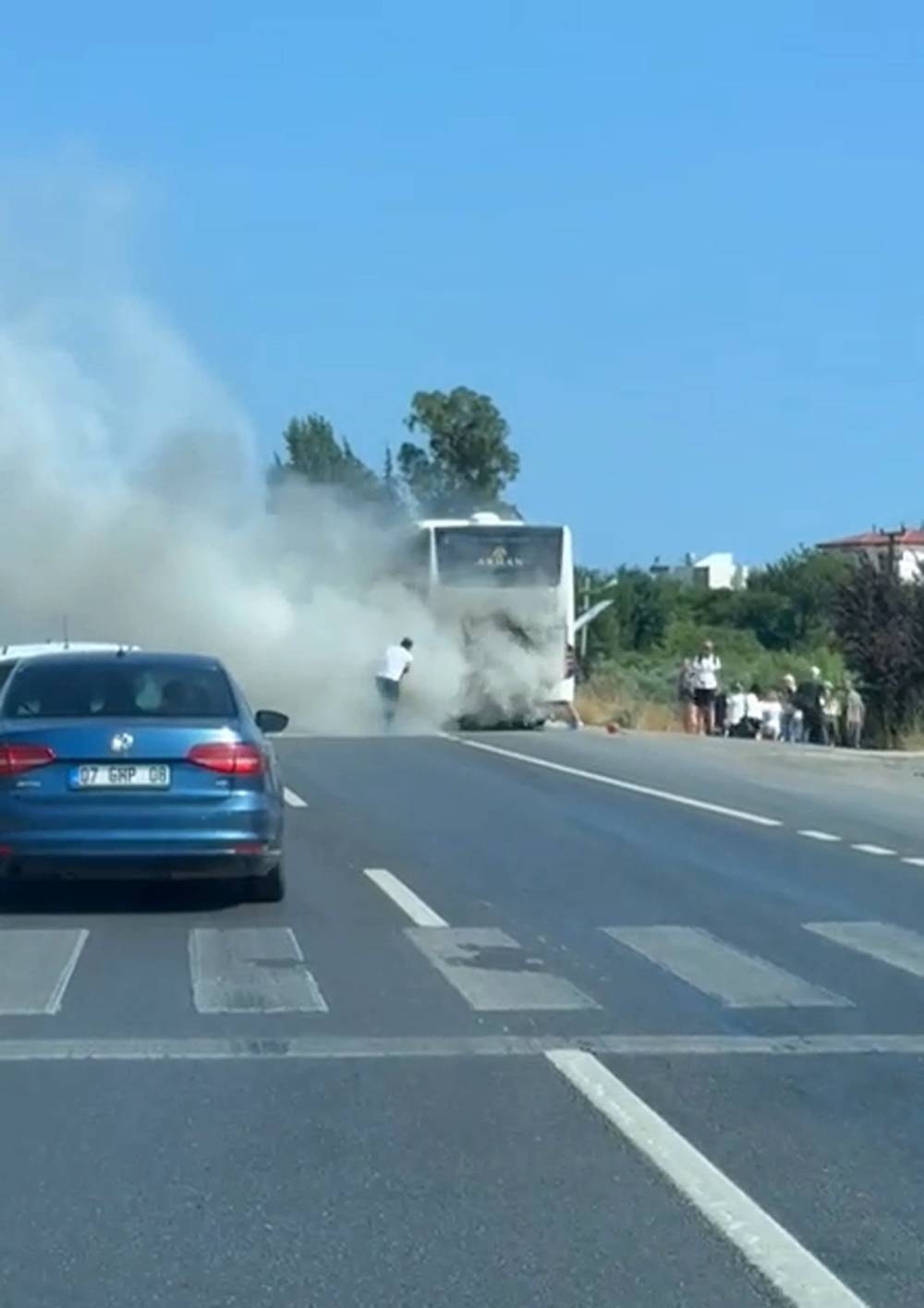 Antalya Havalimanı'ndan aldığı Polonyalı 43 turisti Alanya'daki otellerine götürmek üzere yola çıkan Yunus Bişirik'in kullandığı 07 GFU 03 plakalı tur otobüsü, D400 kara yolunun Manavgat yakınlarında motor bölümünden alev alarak yanmaya başladı. Yangını fark eden şoför, otobüsü yol kenarına park ederek, yangın tüpüyle müdahale etti. Bu sırada aralarında çocukların da bulunduğu otobüsteki turistler tahliye edildi. Haber verilmesi üzerine olay yerine gelen itfaiye ekipleri yangına müdahale ederek söndürdü ve soğutma çalışması yaptı. Otobüste çıkan yangın sonrasında Polonyalı turistler, olay yerine çağrılan otobüslerle konaklayacakları otellere götürüldü. (DHA)