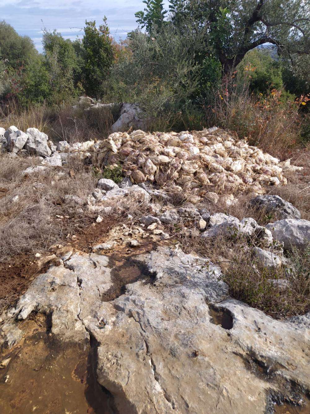 Tarsus'ta boş araziye bırakılmış yüzlerce ölü tavuk bulundu