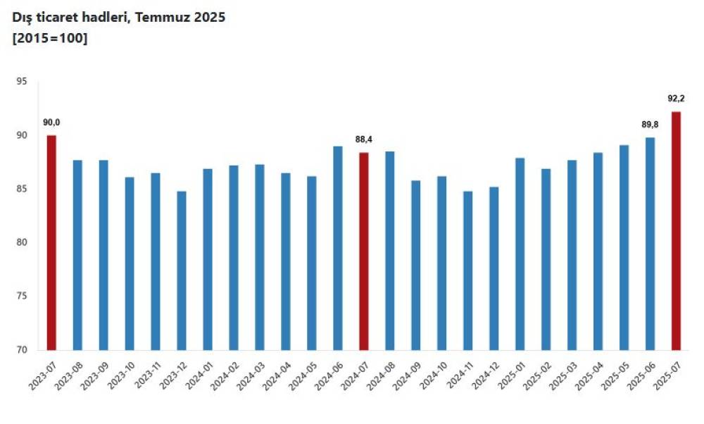 ANKARA, (DHA)- TÜRKİYE İstatistik Kurumu (TÜİK), 2025 yılı Temmuz ayında dış ticaret haddinin, bir önceki yılın aynı ayına göre 3,8 puan artarak 92,2 olduğunu açıkladı.