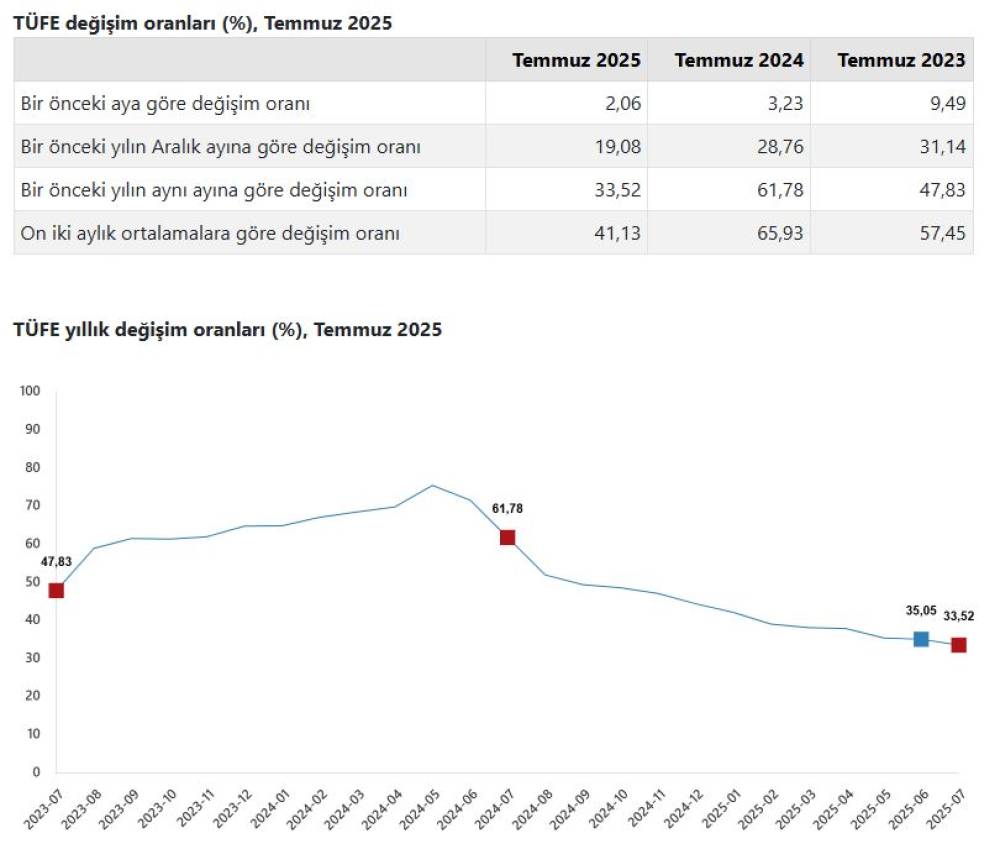 TÜİK, Temmuz 2025 dönemine ilişkin tüketici fiyat endeksi verilerini açıkladı. Buna göre; tüketici fiyatları bir önceki aya göre yüzde 2,06, bir önceki yılın aralık ayına göre yüzde 19,08, bir önceki yılın aynı ayına göre yüzde 33,52 ve 12 aylık ortalamalara göre yüzde 41,13 arttı.