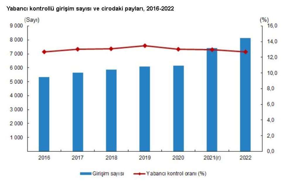 ANKARA, (DHA)- TÜRKİYE İstatistik Kurumu (TÜİK), Türkiye'de yabancı kontrolündeki girişimlerin toplam cirodaki payının 2022 yılında yüzde 12,7 olduğunu açıkladı.