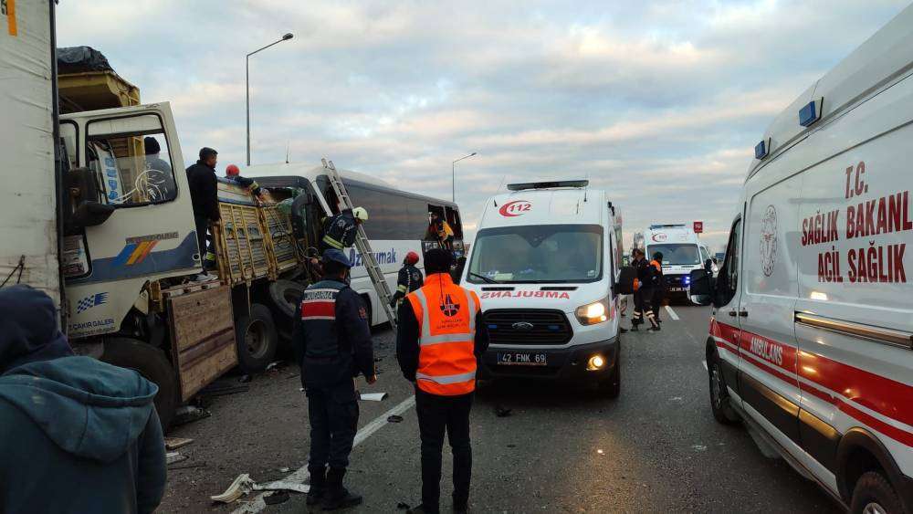 KONYA,(DHA)- KONYA'nın Ilgın ilçesinde, yolcu otobüsünün, park halindeki kamyona, kamyonun da önünde park halindeki TIR'a çarptığı kazada 2 kişi öldü, 24 kişi de yaralandı.